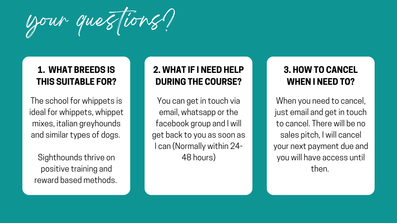 The School For Whippets is a monthly subscription. You will pay £25 per month until you cancel. You will have access to courses while your subscription is ongoing. You will lose access to courses when you cancel.