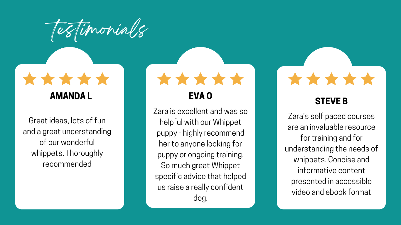 We are so happy to have found Zara! Zara and her knowledge of whippets is incredible. We attended a few online classes and signed up to the School for whippets and saw massive improvements in the behaviour of our whippet Cream. She is easy to understand and breaks the training into bite size concepts so they are very easy to follow and do on your own. I don’t think our dog would be the same well behaved dog she is today without Zara’s help.