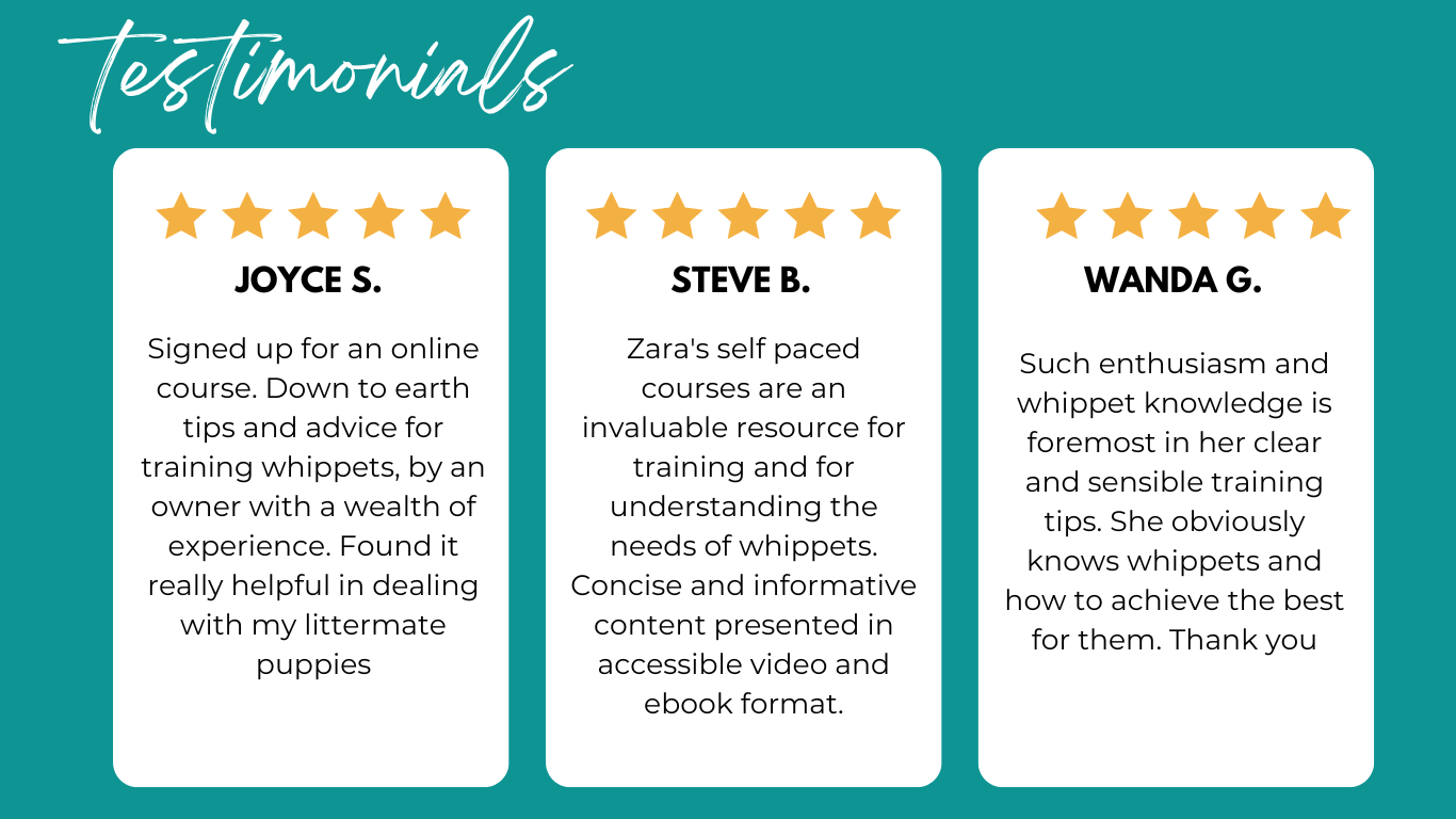 I find Zara’s advice on whippet training very helpful and believable because she has whippets herself and so totally understands their behaviours. I haven’t found anyone else nearly as good as her 😊